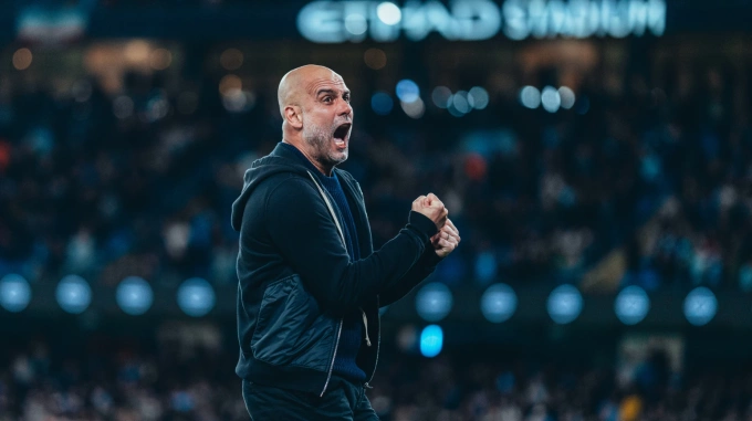 HLV Pep Guardiola mừng bàn ấn định chiến thắng 2-1 của Matheus Nunes. Ảnh: Man City