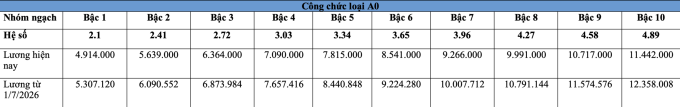 Bảng lương công chức dự kiến từ 1/7/2026 như sau: