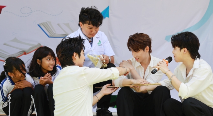 Các nghệ sĩ tham gia thực hành sơ cấp cứu và trao phần thưởng cho học sinh thực hành xuất sắc,tại lễ bàn giao thư viện do Quỹ Hy vọng - VnExpress tặng trường THCS Thanh Sơn,tỉnh Vĩnh Long,ngày 10/3. Video: Công Khang - Trung Kiên