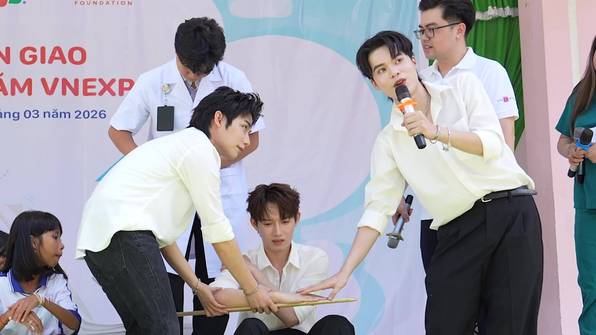 Bác sĩ Phạm Thái Ngọc Long và điều dưỡng Trịnh Thiên Thanh,Khoa Cấp cứu Bệnh viện Quân y 175,trực tiếp hướng dẫn các nghệ sĩ và học sinh Trường THCS Thanh Sơn,xã Trà Cú,Vĩnh Long,cách xử trí khi gặp tình huống khẩn cấp. Hoạt động diễn ra ngày 10/3,trong khuôn khổ chương trình Trao tặng 25 thư viện sách nhân dịp 25 năm thành lập báo VnExpress.