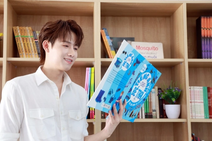 Ca sĩ Hồ Đông Quan đọc sách trong thư viện do VnExpress trao tặng Trường THCS Thanh Sơn,ngày 10/3. Ảnh: Đức Đồng