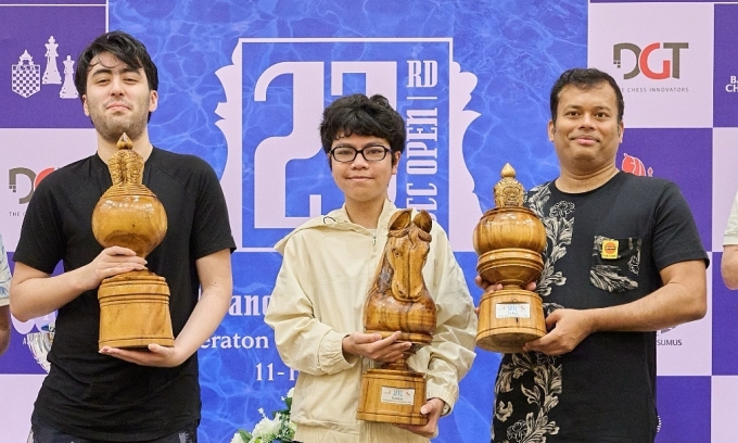 Kỳ thủ Đầu Khương Duy (giữa) với chức vô địch Bangkok Mở rộng tại Hua Hin,Thái Lan ngày 18/4/2026. Ảnh: BCC