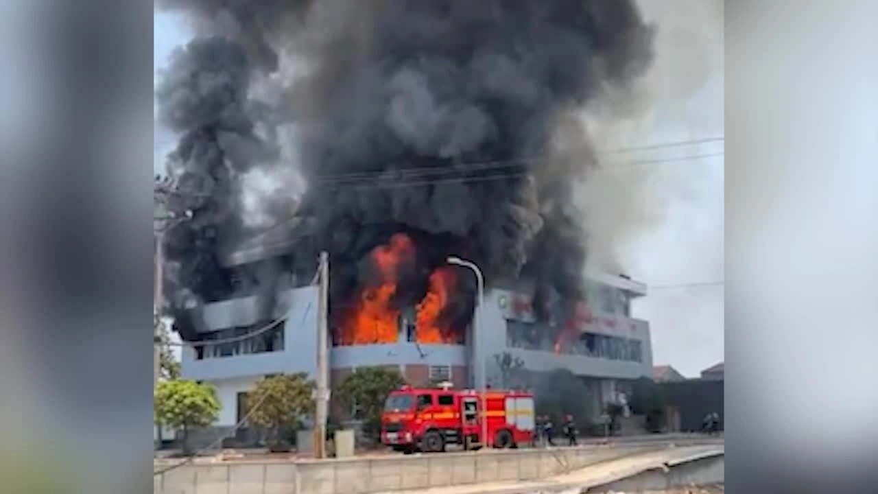 Khu trưng bày sản phẩm rộng hàng nghìn mét vuông của công ty gỗ ở phường Thành Sen bốc cháy dữ dội, trưa 12/4.
